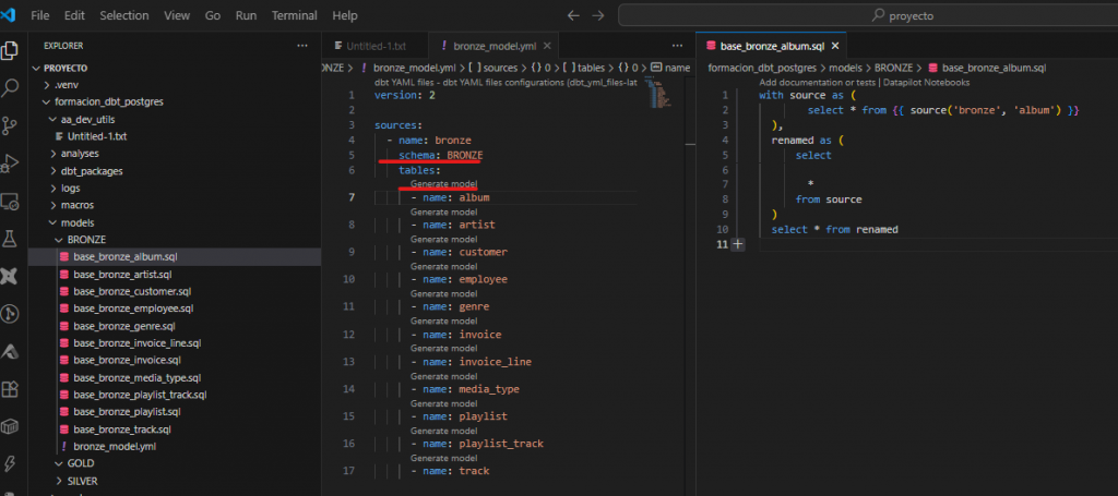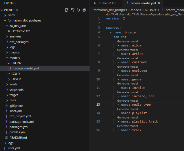 - Crear dentro de la carpeta BRONZE, el fichero bronze_model.yml y copiar el texto generado por el comando anterior dentro del fichero.