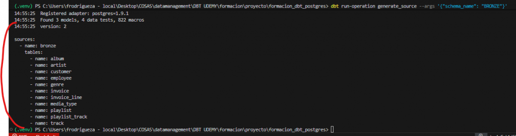 - dbt run-operation generate_source –args ‘{«schema_name»: «BRONZE»}’
