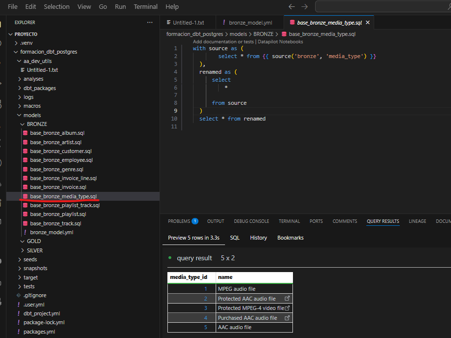 - Es imprescindible configurar el atributo schema: BRONZE para indicar a DBT el esquema de PostgreSQL sobre el que debe operar.