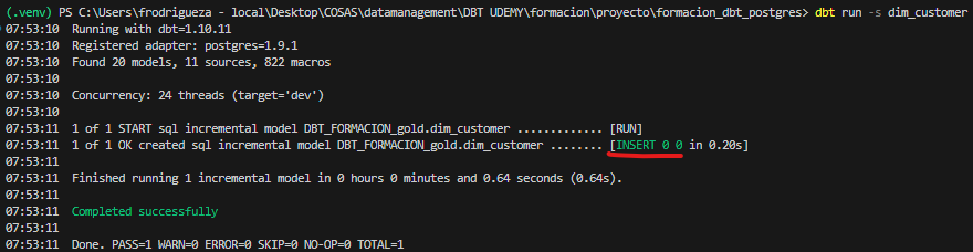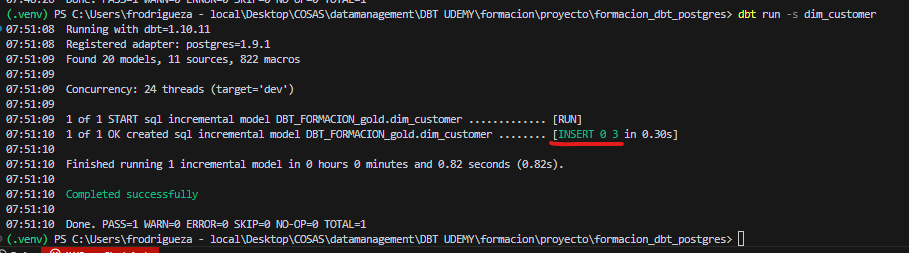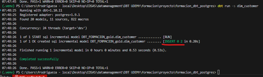 Si el registro ya existe, DBT elimina la fila anterior antes de insertarla nuevamente.