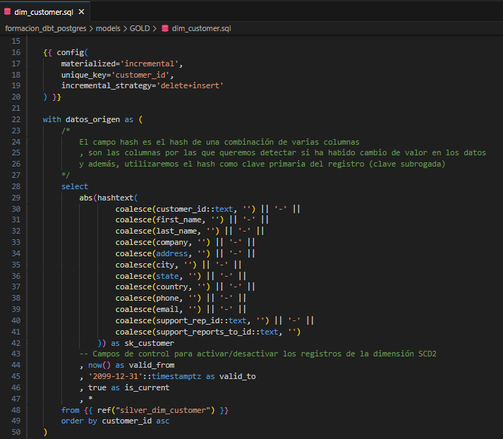 El campo utilizado para identificar los registros a eliminar es customer_id. Internamente, DBT, antes de actualizar un modelo, verifica que todos los registros de la query existan; si existen, los elimina para luego volver a insertarlos.