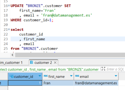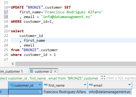 Se realizará una prueba utilizando customer_id = 1, modificando el nombre en la capa Bronze (origen), para posteriormente ejecutar nuevamente el modelo y verificar que el proceso funciona correctamente.