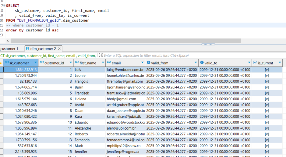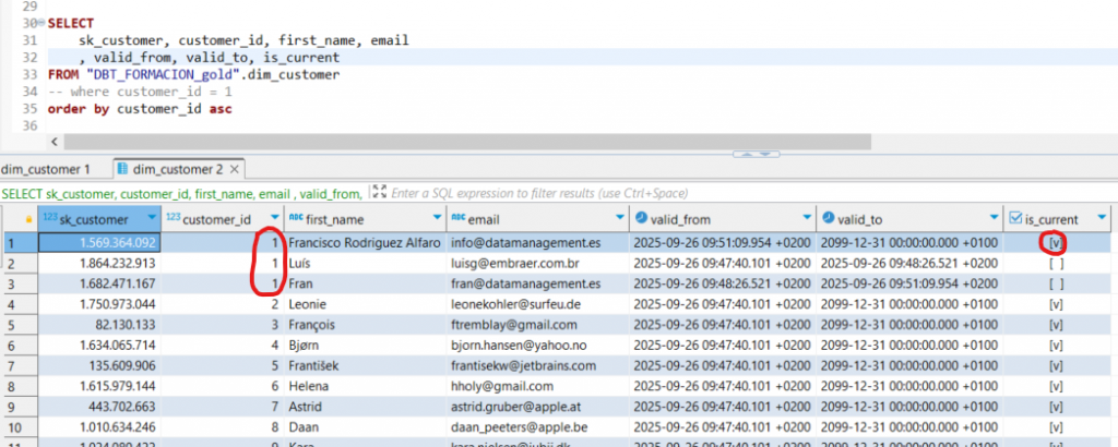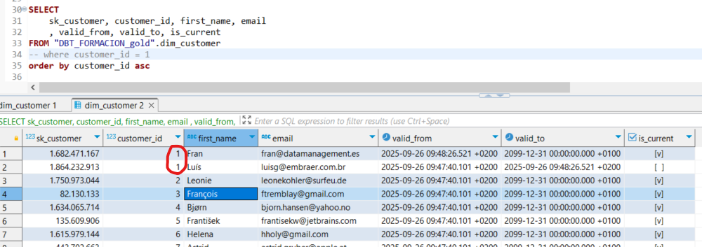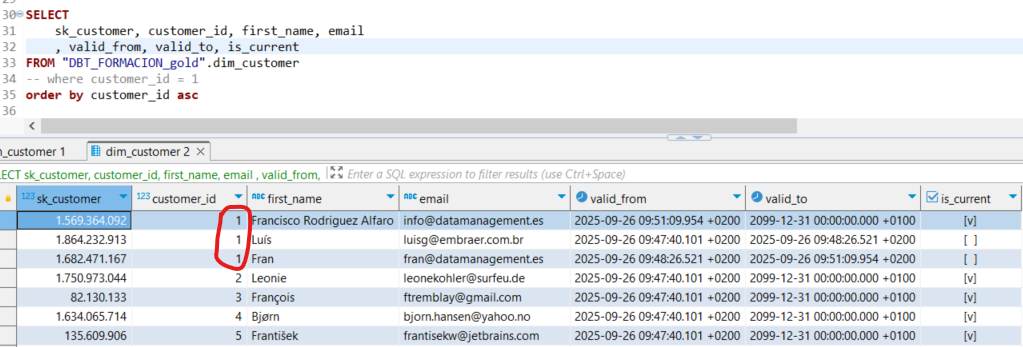 El modelo ha eliminado los dos registros con customer_id = 1 de la dimensión para insertar tres registros: el registro desactivado, el registro que se acaba de desactivar y el nuevo registro.
