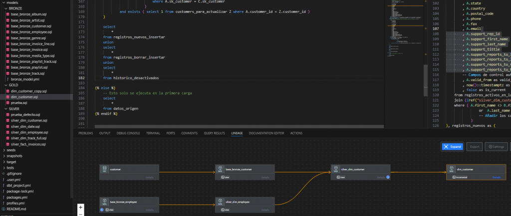 A continuación, en el visor de VSCode es posible depurar el modelo antes de ejecutar el comando dbt run