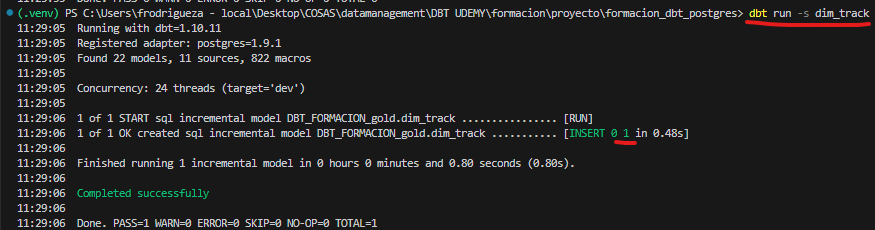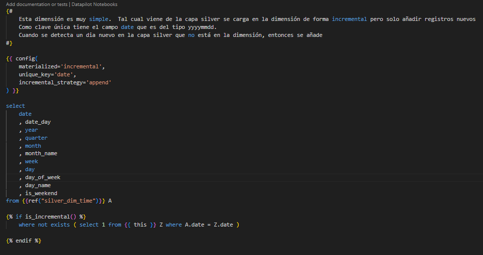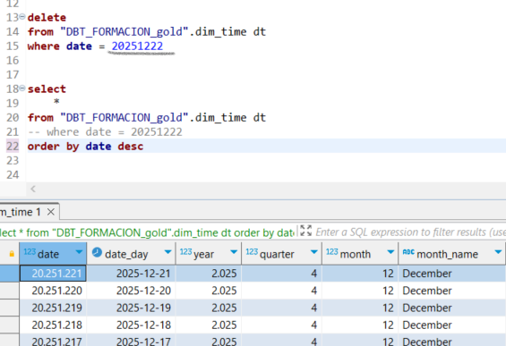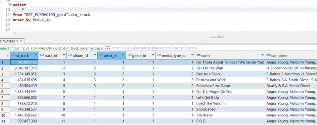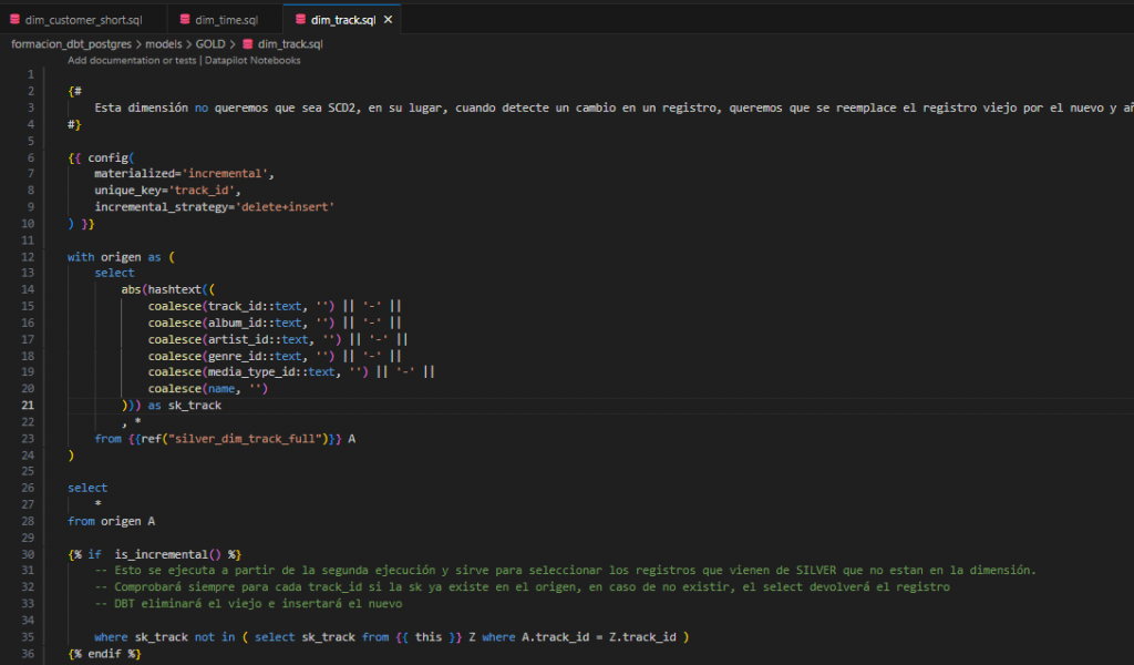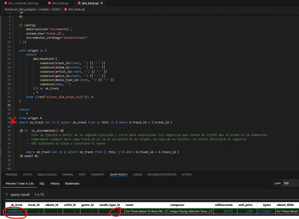 Para facilitar la depuración, se ha añadido un WHERE fuera de la función is_incremental(). Es importante retirar este WHERE posteriormente, ya que, de lo contrario, en una primera ejecución fallará al no existir aún la tabla dim_track. El WHERE solo es válido una vez que la dimensión ha sido creada, es decir, después de la primera ejecución.