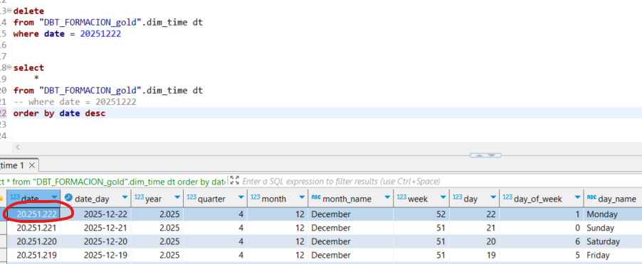 Se procede a eliminar el registro correspondiente a 20251222.