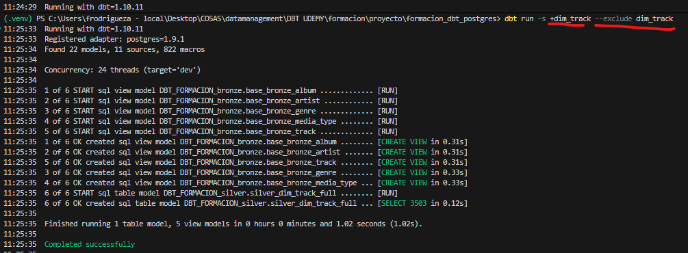 dbt run -s +dim_track –exclude dim_track