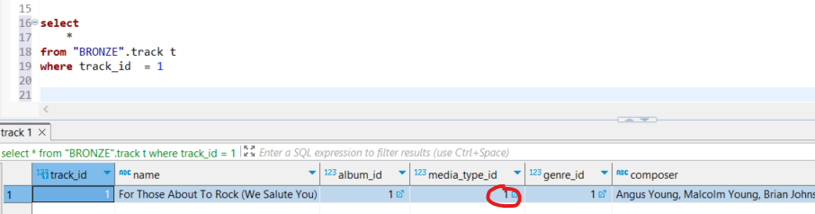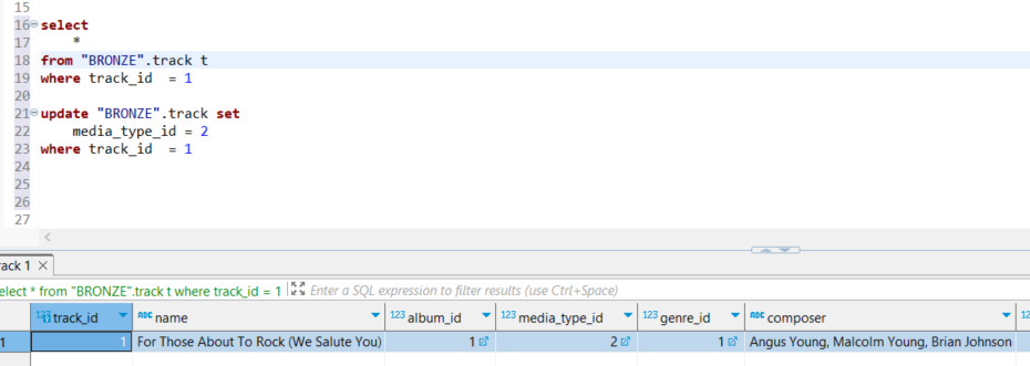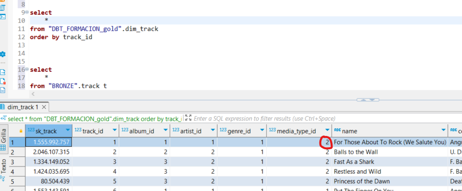 En el visor de VSCode se observa que el registro que ha cambiado corresponde a track_id = 1. Por lo tanto, al ejecutar dbt run, DBT eliminará este registro de la dimensión antes de volver a insertarlo.