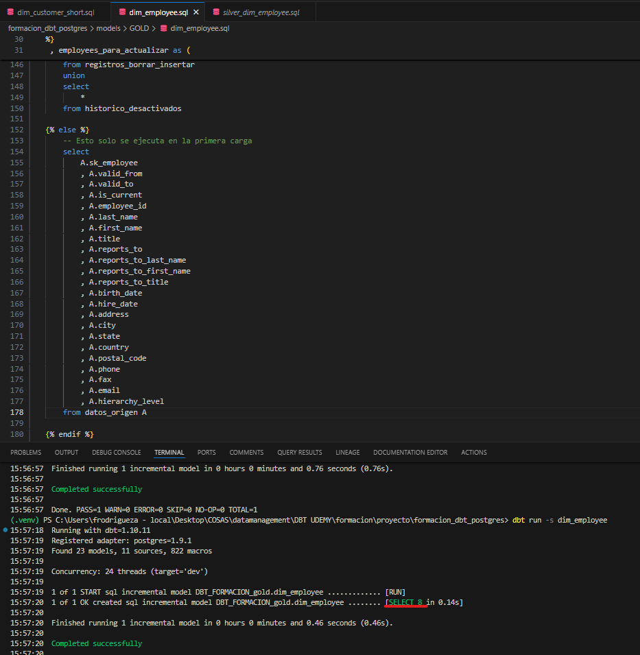 Modelo DBT incremental con delete + insert, utilizando la clave única employee_id para identificar registros a actualizar.
