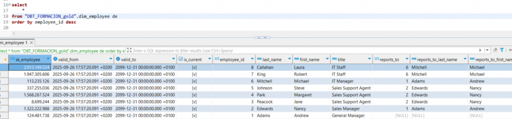 Si se ejecuta el modelo sin realizar cambios en el origen, no ocurre ninguna modificación: como DBT no detecta diferencias entre los datos de origen y la dimensión, no se eliminan ni se insertan registros.