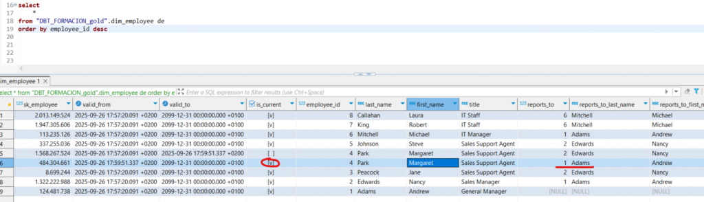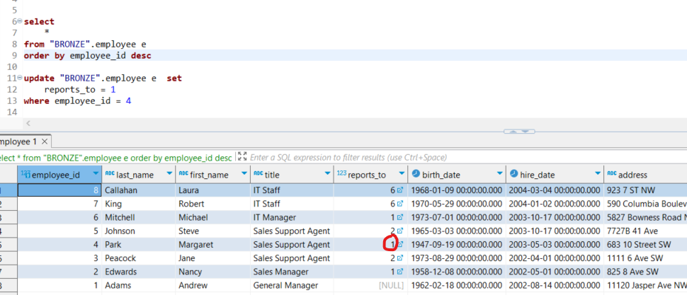 Para probar la actualización de los registros de la dimensión employee en la capa Bronze, se modificará la información de manera que el empleado 4 reporte directamente al CEO de la empresa.