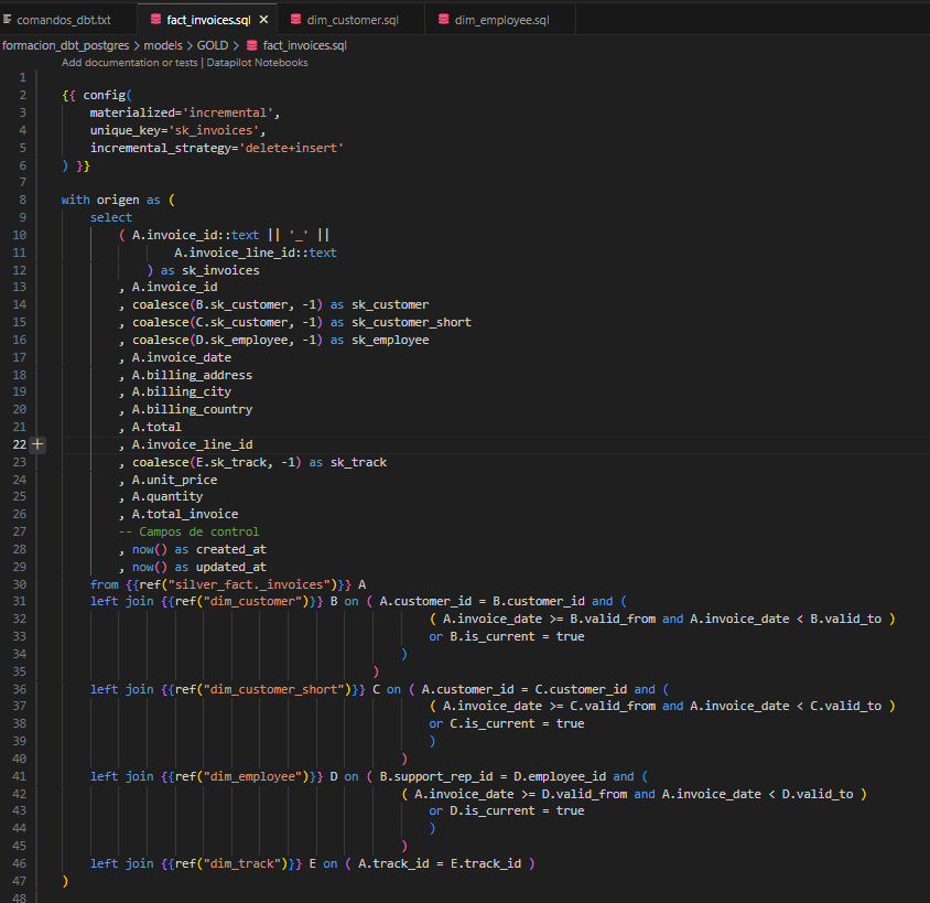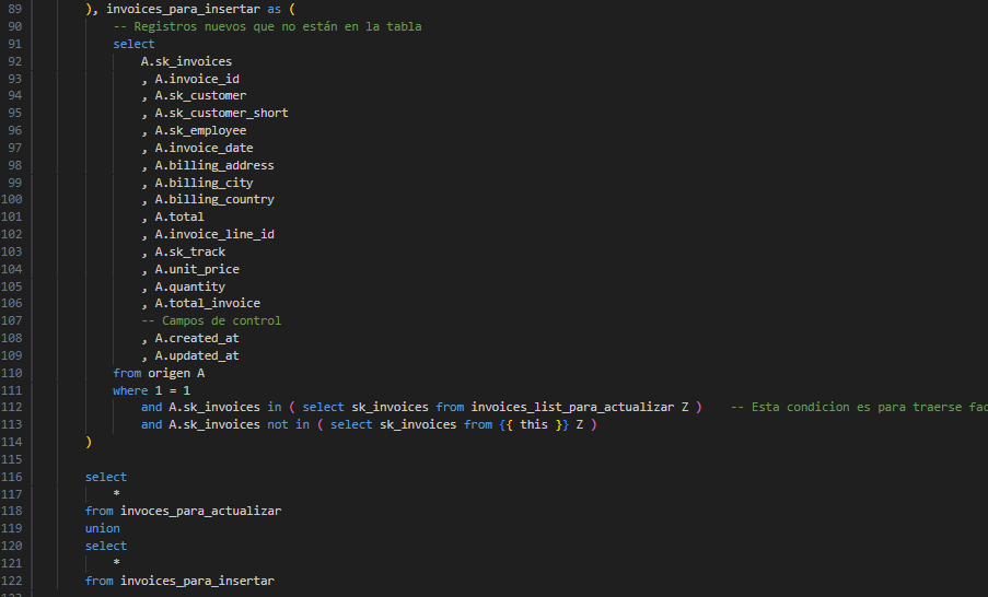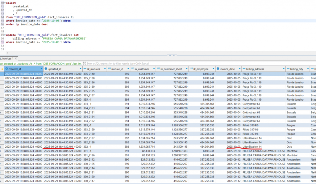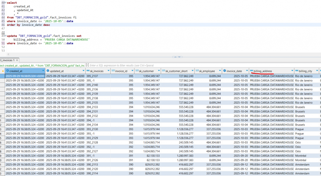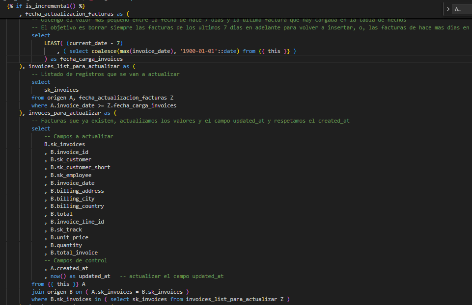 En ejecuciones posteriores, el modelo de DBT obtendrá la fecha de la última factura registrada (o a partir de 7 días atrás) para determinar el listado de registros que deben insertarse o actualizarse. Este comportamiento es similar al de las dimensiones SCD2, donde se gestionan los registros históricos y las actualizaciones de manera incremental.