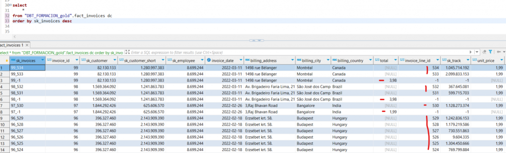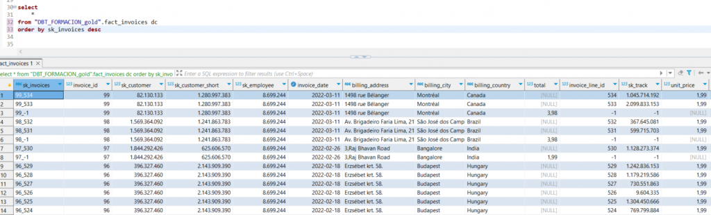 Durante la primera carga, DBT genera automáticamente una clave subrogada para cada registro, asegurando la integridad y unicidad en la tabla de hechos.