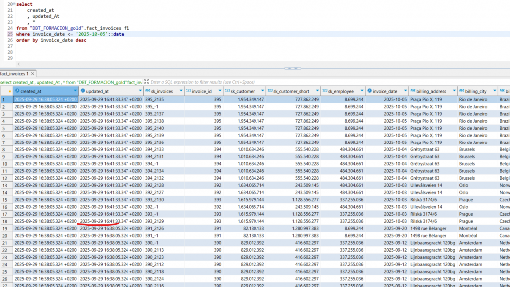 Si se ejecuta el modelo, todas las facturas posteriores al 22 de septiembre se actualizarán de manera incremental, insertando nuevos registros y actualizando aquellos que hayan sufrido modificaciones.