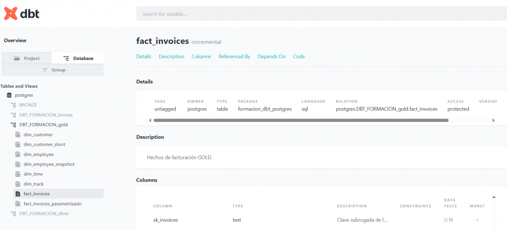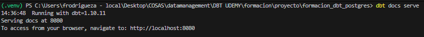 - A continuación se muestran capturas del servidor web que DBT levanta, el cual permite explorar la documentación generada de los modelos, columnas y tests.