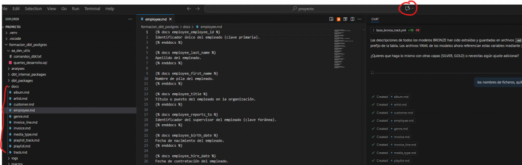 - Se puede solicitar a Copilot que realice todas las tareas descritas anteriormente: generar descripciones de tablas y campos, aplicar tests básicos, extraer documentación en Markdown y actualizar referencias en los modelos.