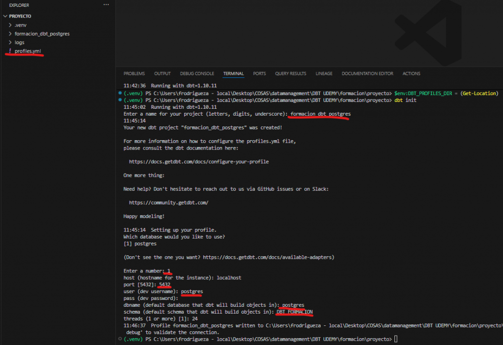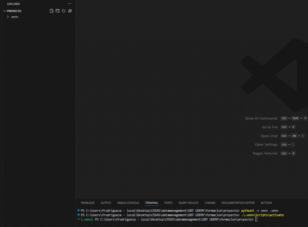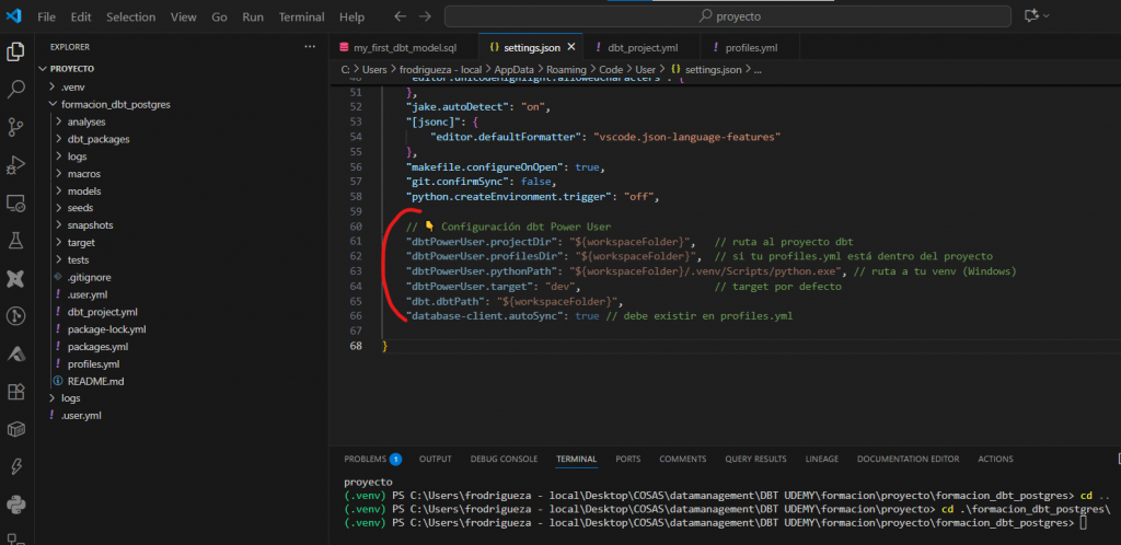 «dbtPowerUser.pythonPath»: «${workspaceFolder}/.venv/Scripts/python.exe», // ruta a tu venv (Windows)