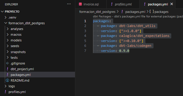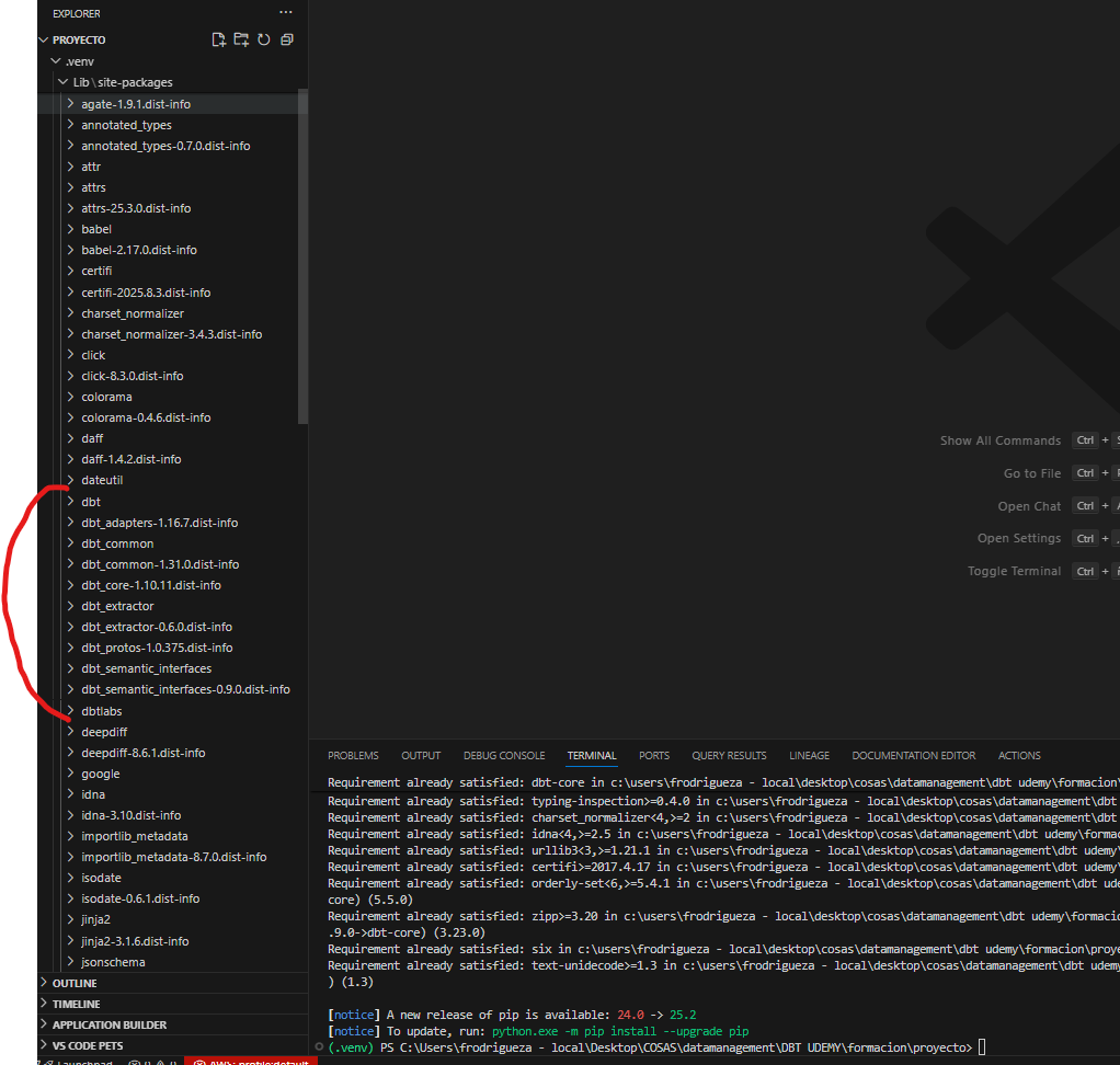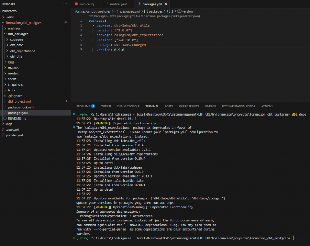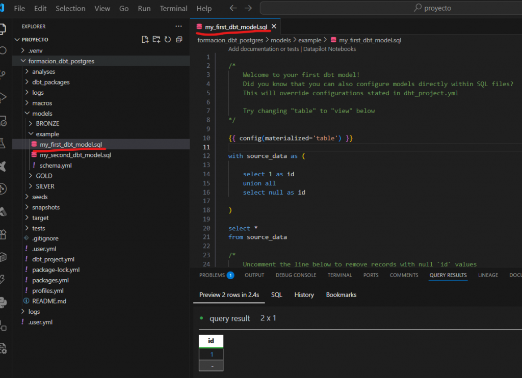 Una vez instalado DBT y configurado VSCode, el siguiente paso es realizar nuestra primera ejecución de DBT para confirmar que todo está funcionando correctamente y familiarizarnos con la herramienta.