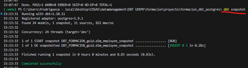 DBT procesará todos los snapshots, generando y almacenando los registros correspondientes según los cambios detectados.