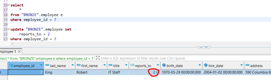 - Se procederá a actualizar el campo reports_to en la capa Bronze, que sirve como origen de todos los datos.