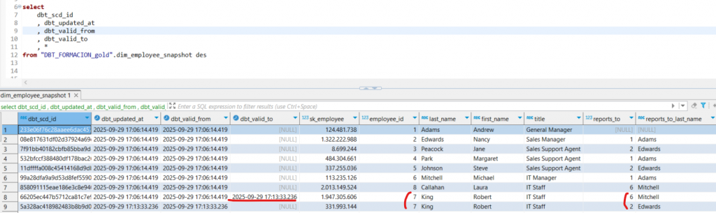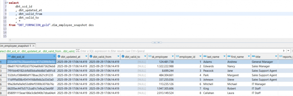- Campo de comparación: DBT compara los registros mediante un campo hash o conjunto de campos relevantes (por ejemplo, sk_employee) para detectar cambios.
