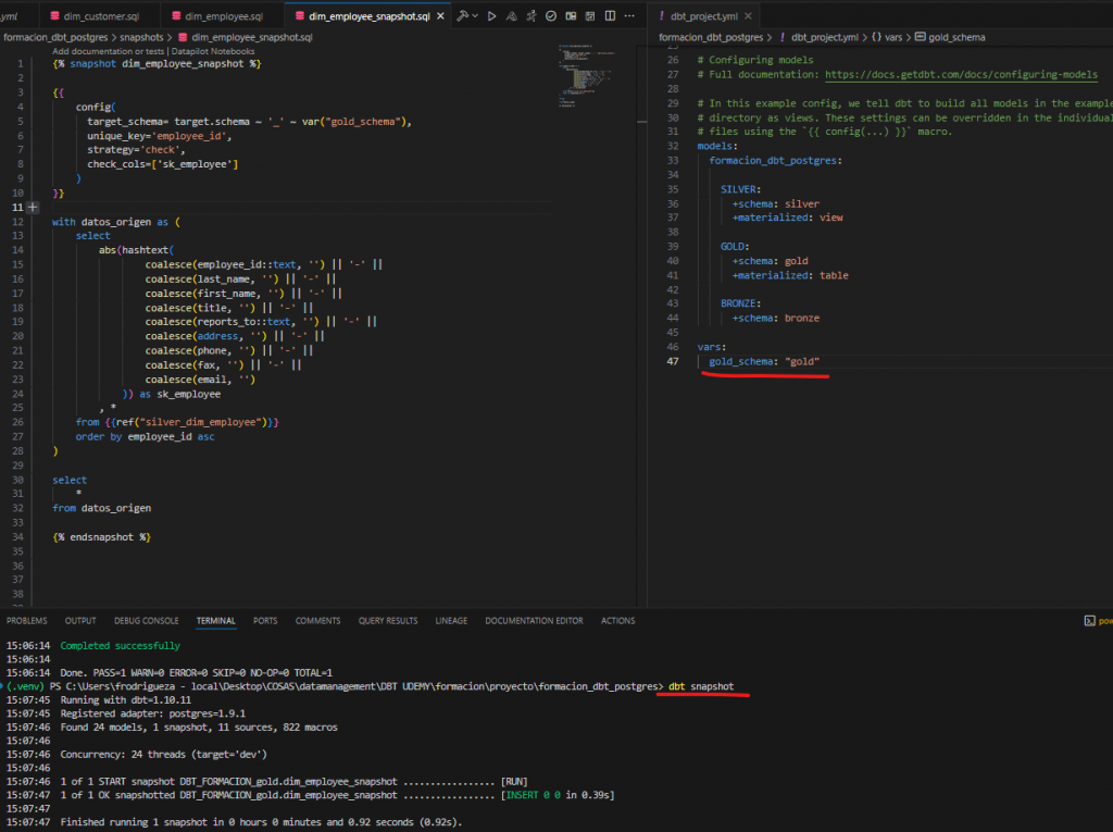 - Esto permitirá que DBT detecte cambios en el origen y actualice los registros históricos según corresponda.